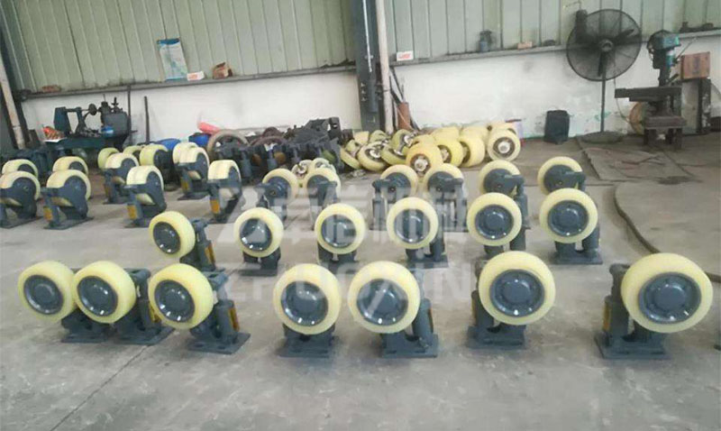 滾輪罐耳用螺栓與提升容器連接,調(diào)整好三個(gè)滾輪罐耳相對(duì)罐道的位置,保證與罐道的間隙一致(間隙約為2mm),軸心線水平,徑向中心線垂直于罐道面,然后鎖緊固定螺栓。