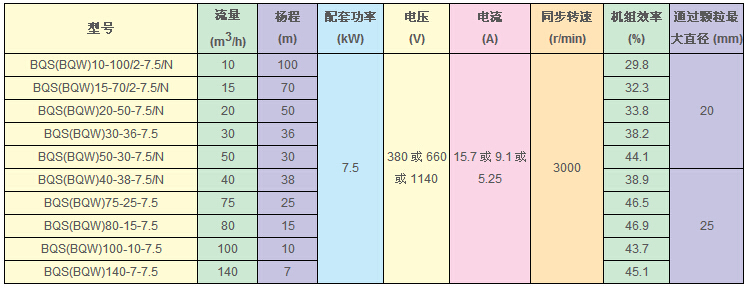 BQS(W)7.5KW的礦用隔爆型排污排沙潛水電泵技術(shù)參數(shù):