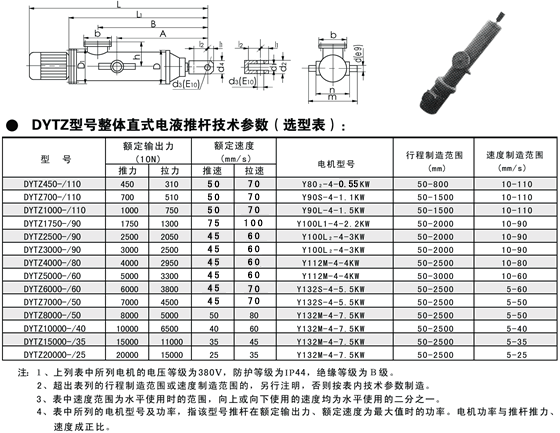 - DYTZ型整體式電液推桿是一種集機(jī)、電、液為一體的液壓驅(qū)動(dòng)機(jī)械手,適用于需要往復(fù)推拉直線(或往復(fù)旋轉(zhuǎn)一定角度)運(yùn)動(dòng),也可用于需要上升、下降或夾緊工作物的場所,并可實(shí)現(xiàn)遠(yuǎn)距離危險(xiǎn)地區(qū)的集中或自動(dòng)控制。DYTZ型整體式電液推桿廣泛應(yīng)用于冶金、礦山、電力、煤炭、機(jī)械、交通、糧食、化工、水泥、水利、建材、運(yùn)輸?shù)炔块T,是一種通用的動(dòng)力源。DYTZ型整體式電液推桿是一種機(jī)、電、液一體化的新型柔性傳動(dòng)機(jī)構(gòu),它以執(zhí)行機(jī)構(gòu)(油缸)、控制機(jī)構(gòu)(液壓控制閥組)和動(dòng)力源(油泵電機(jī)等到)組成。根據(jù)現(xiàn)場安裝空間及用戶使用情況電液推桿可有多種結(jié)構(gòu)形式(具體見電液推桿外形尺寸圖,也可根據(jù)用戶要求定制樣式)。電動(dòng)機(jī)通過正反轉(zhuǎn)驅(qū)動(dòng)雙向液壓泵正反輸出壓力油,經(jīng)液壓控制閥送至油缸,也實(shí)現(xiàn)活塞桿的往復(fù)運(yùn)動(dòng)。液壓控制閥組主要由溢流閥,吸油單向閥,調(diào)速閥(用戶要求),液控單向閥(液壓鎖)等組成也可根據(jù)電液推桿的工作特性,設(shè)計(jì)不同功能的油路組合閥,滿足其工作要求。一般有推出自鎖,拉回自鎖和推拉均自鎖;運(yùn)行速度有可調(diào)速型,不可調(diào)速型;電液推桿工作角度有水平推,向上推(包括斜向上),向下推(包括斜向下)等幾種。電液推桿主要有以下優(yōu)點(diǎn):(1)結(jié)構(gòu)緊湊、安裝方便、占據(jù)空間小、維護(hù)簡單。(2)可帶負(fù)荷起動(dòng),具有過載保護(hù)功能。(3)回路設(shè)雙向液壓鎖,可停在規(guī)定行程范圍內(nèi)的任意位置并自鎖,且保持輸出力不變。(4)推拉力,速度(用戶要求)無級(jí)可調(diào),驅(qū)動(dòng)力范圍極廣。(5)因故斷電,推桿自鎖,避免發(fā)生事故。(6)采用全液壓傳動(dòng),動(dòng)作靈敏,運(yùn)行平穩(wěn),能有效緩沖外來沖擊力,行程控制精確(≥0.5mm)(7)機(jī)電液一體化全封閉結(jié)構(gòu),工作油路循環(huán)于無壓的封閉鋼筒里,體積小,不滲油,在惡劣的工作環(huán)境下,不吸塵,不進(jìn)水,內(nèi)部不銹蝕,使用壽命長。DYTZ型整體式電液推桿是我公司成立前針對(duì)國內(nèi)中,大推力檔電動(dòng)拉桿產(chǎn)品空白,而顧客又有需求的情況下于1988年起率先自主開發(fā)并獨(dú)家生產(chǎn)的系列產(chǎn)品,是我公司多種電動(dòng)推拉桿系列產(chǎn)品之一。該產(chǎn)品已在首鋼,包鋼等多家大鋼鐵企業(yè)推廣應(yīng)用,也可用于其他需要大推,拉力的場合。其使用條件為環(huán)境溫度-15℃-60℃,相對(duì)濕度≤85%。DYTZ型整體式電液推桿由驅(qū)動(dòng)電機(jī),減速器,滑動(dòng)螺旋傳動(dòng)機(jī)構(gòu)等主要部分組成。內(nèi)部設(shè)有彈簧緩沖機(jī)構(gòu)及超載保護(hù)裝置,可保證產(chǎn)品安全,可靠地運(yùn)行。DYTZ型整體式電液推桿的性能參數(shù),外形及安裝尺寸符合《Q/320211AKA01-2000電動(dòng)推拉桿》企業(yè)標(biāo)準(zhǔn)的規(guī)定,其具體數(shù)據(jù)表列如下。