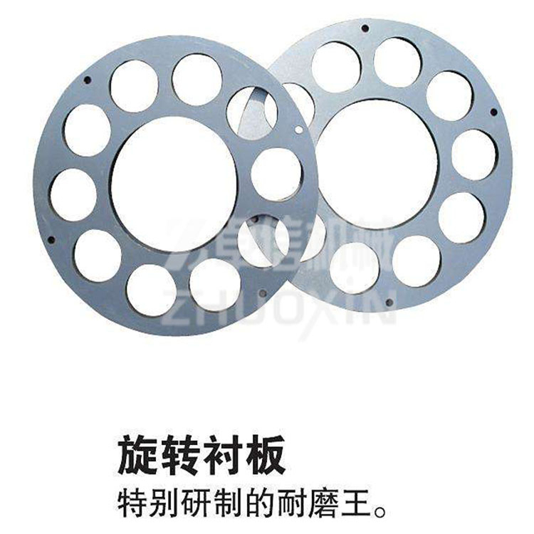 噴漿機(jī)鋼襯板作為噴漿機(jī)的易損件,所以使用是相當(dāng)廣泛的,每個(gè)噴漿機(jī)上都配有兩塊鋼襯板,和橡膠板一樣,兩個(gè)配套使用的,在圓形襯板外圈的孔為料孔,內(nèi)圈的孔為風(fēng)孔,各風(fēng)孔邊緣之間到各料孔邊緣之間的距離均不大于10毫米。