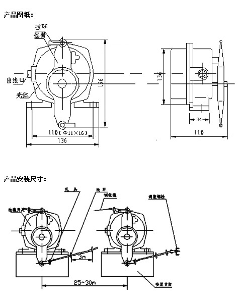 開關(guān)間最大距離:40米(水平)、30米(傾斜)、每3米鋼絲繩有一托環(huán)支撐。